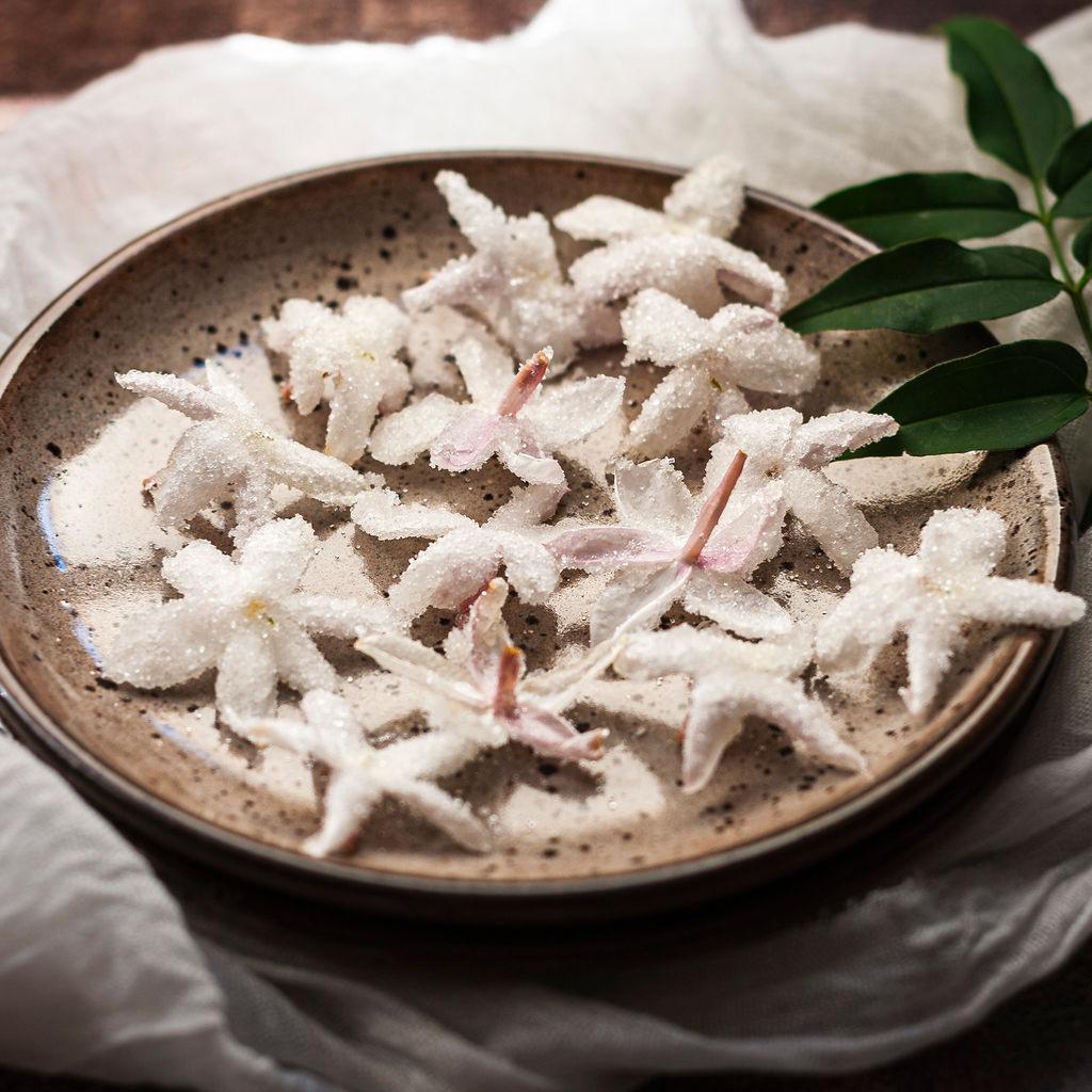 Ingrédients: 50 ml de sucre, 50 ml d’eau et 5 gouttes d’extrait naturel de jasmin Quosentis